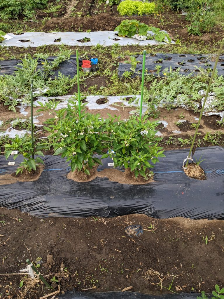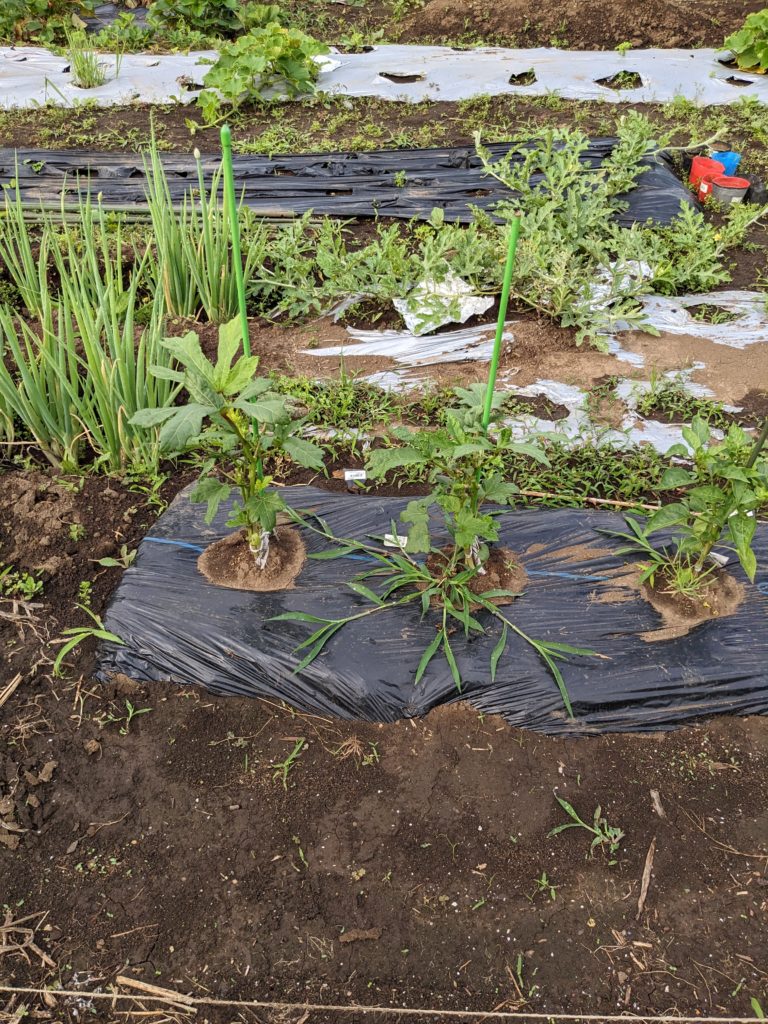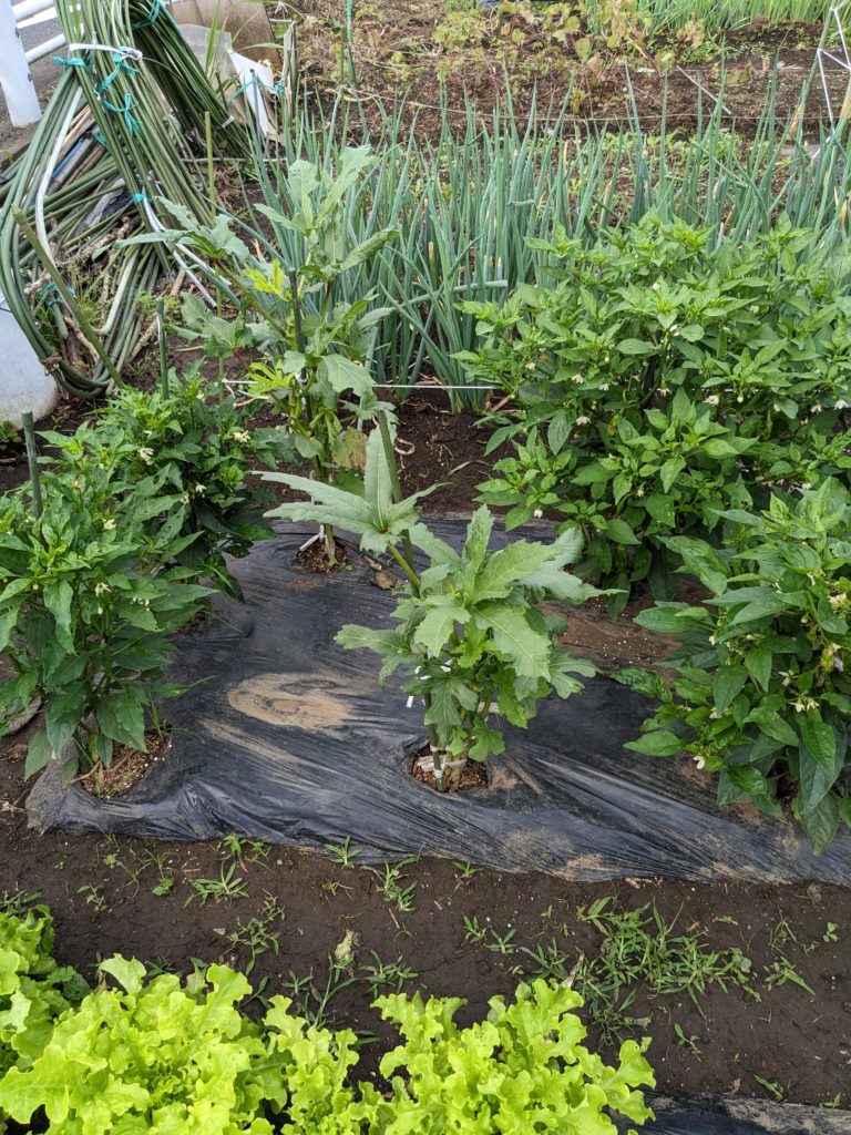オクラは、うちは(右)アリが行列をなして茎がゲンキなかったので、あわてて葉っぱ1枚ずつを、絵の具筆で拭き拭きしました(笑)