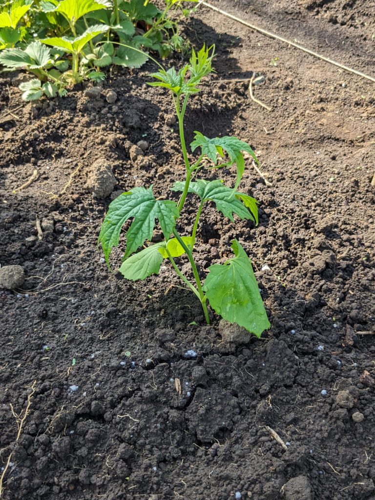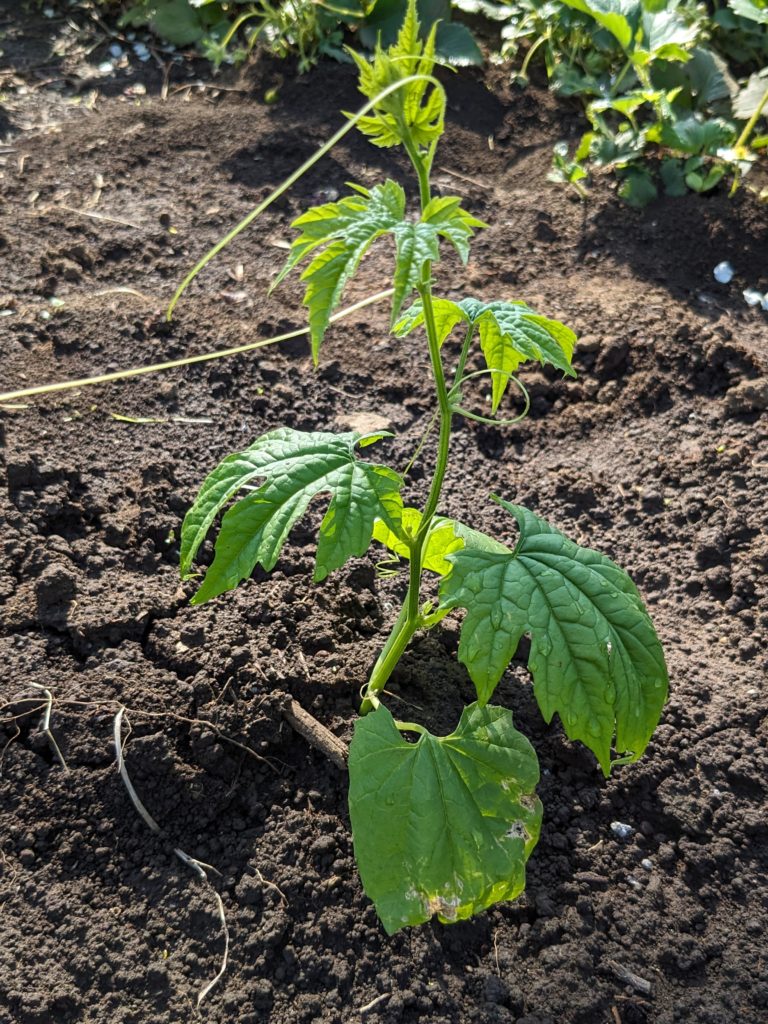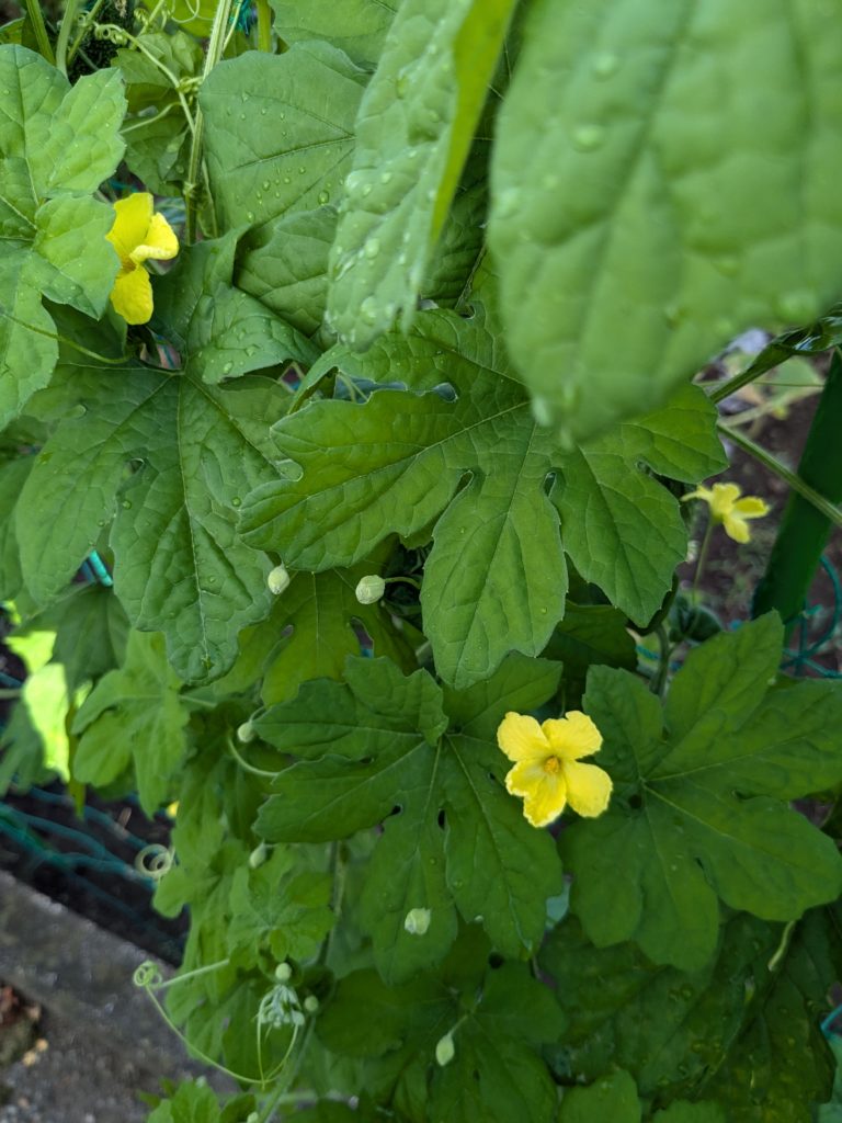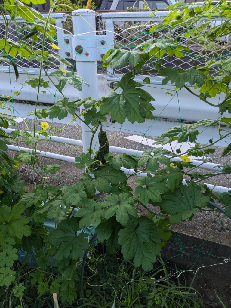 道路側の肥料置き場から生えてきたゴーヤが、すくすく育ってます💚