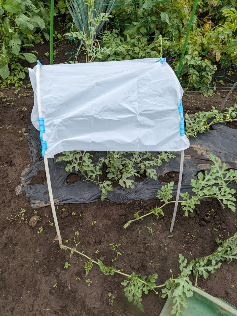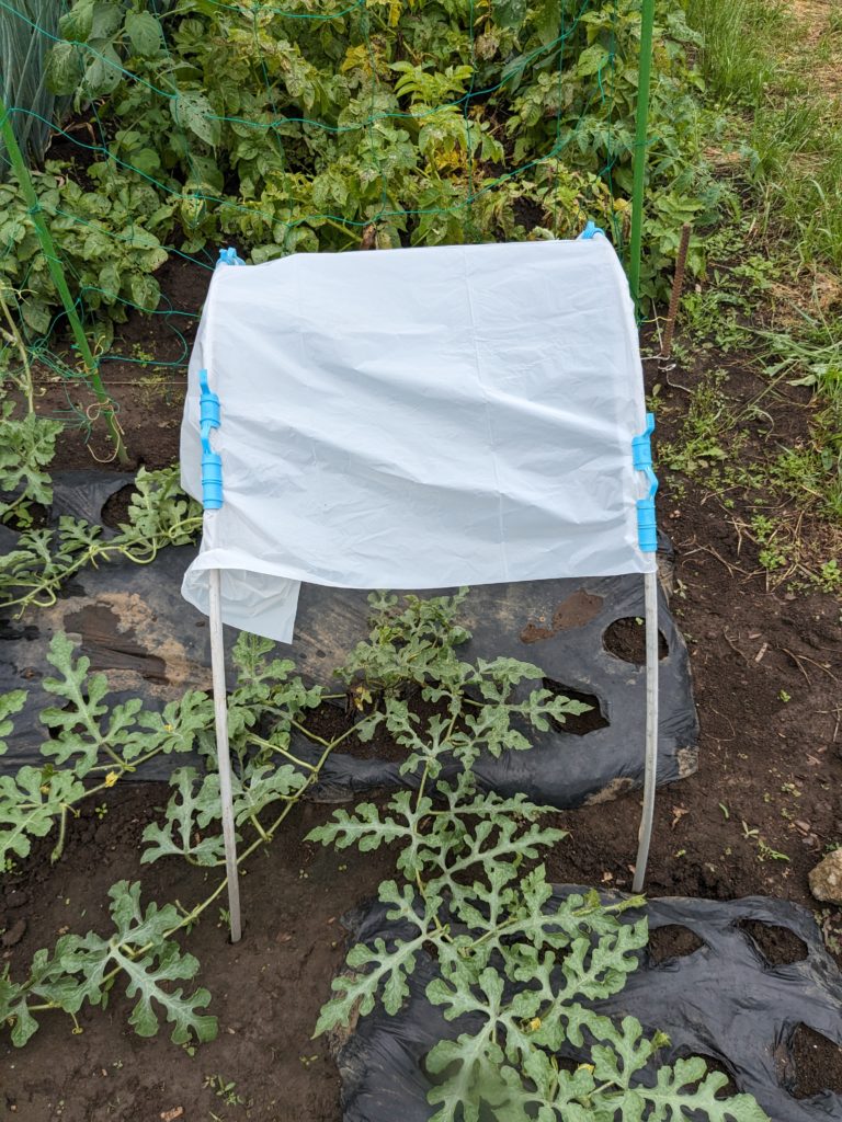 網をイチゴスペースに移動(右下奥)したので、雨除けビニールを作ってみた😂